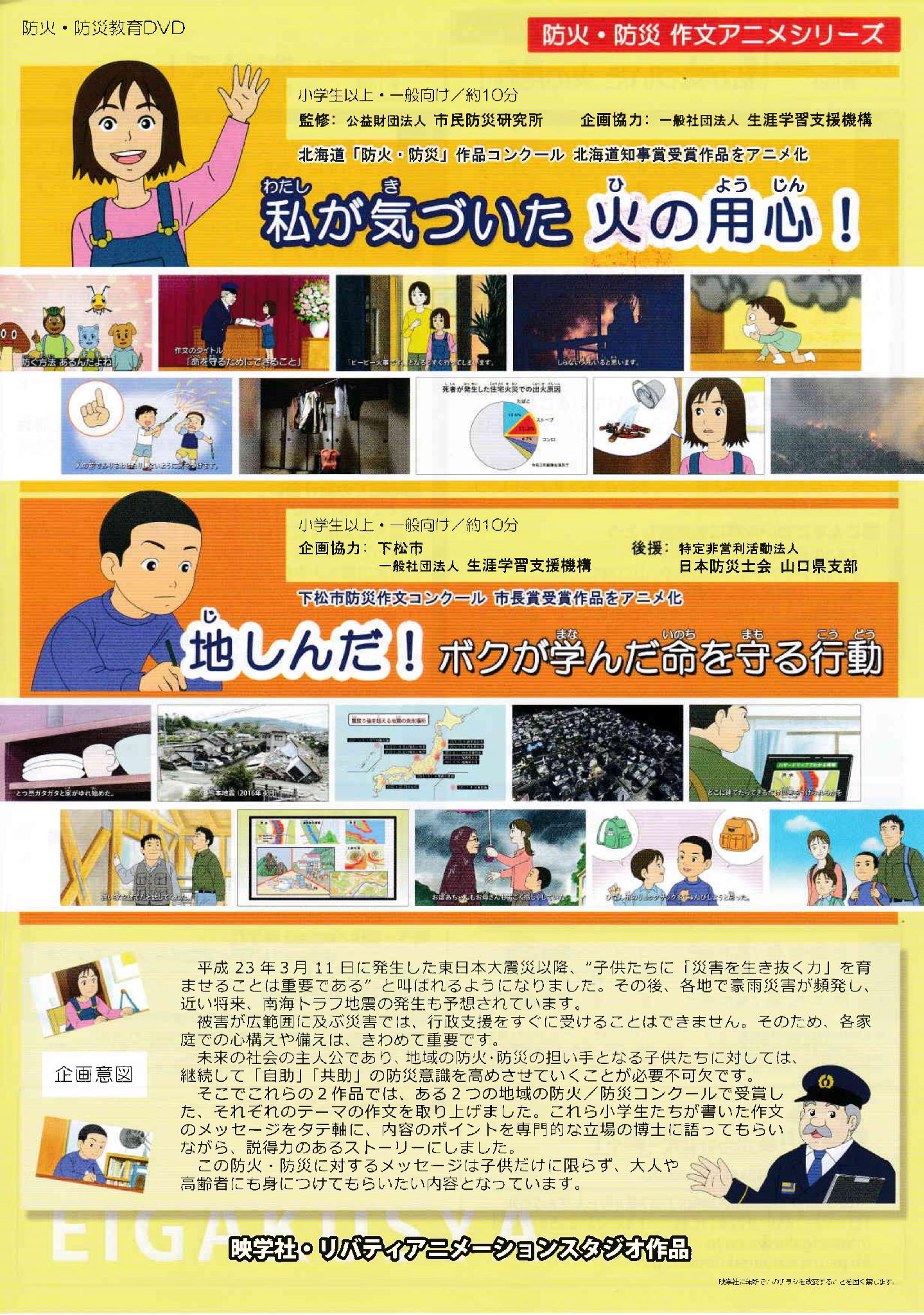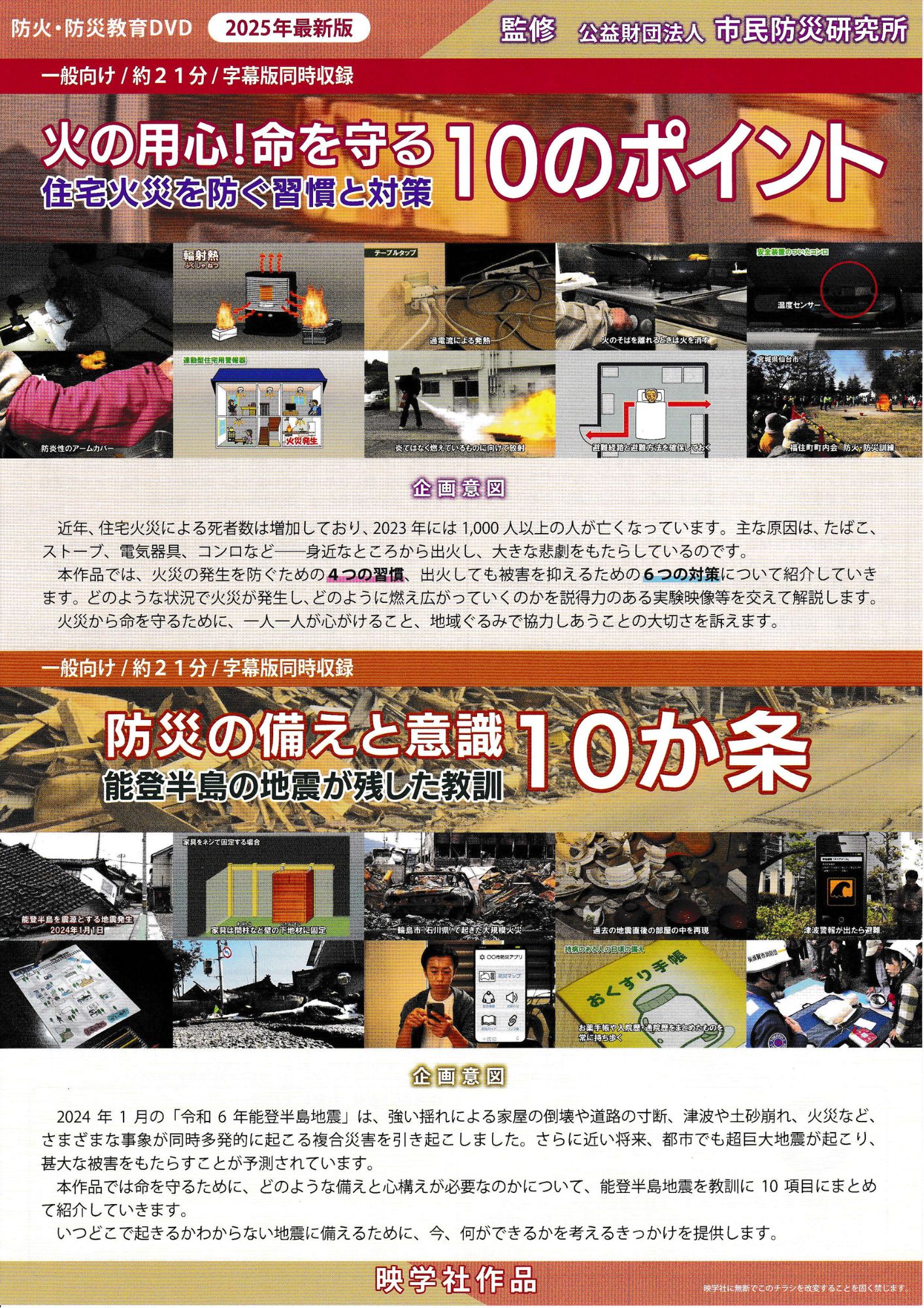 女性の力を防災の力へ 女性消防隊の活躍(21分) | 職場に人む火災~事例から学ぶ防火管理~(24分) | 火災から人を守る 町を守る~消防しょのはたらき~(20分) | 私が気づいた火の用心(約10分) 地しんだ!ボクが学んだ命を守る行動(約10分) |