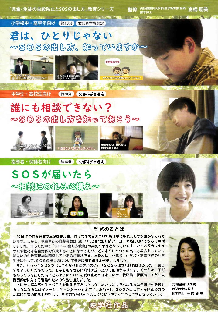 | 〈小学校中・高学年向け〉君は、ひとりじゃない~SOSの出し方、知っていますか~(約18分) 〈中学生・高校生向け〉誰にも相談できない?~SOSの出し方を知っておこう~(約20分) 〈指導者・保護者向け〉SOSが届いたら~相談に乗れる心構え~(約18分) | アニメ多様性の芽をはぐくむ(各12~16分) ①人種・国籍②LGBTQ+③障害 | うしわかまるの 自分らしく生きること(10分) |
