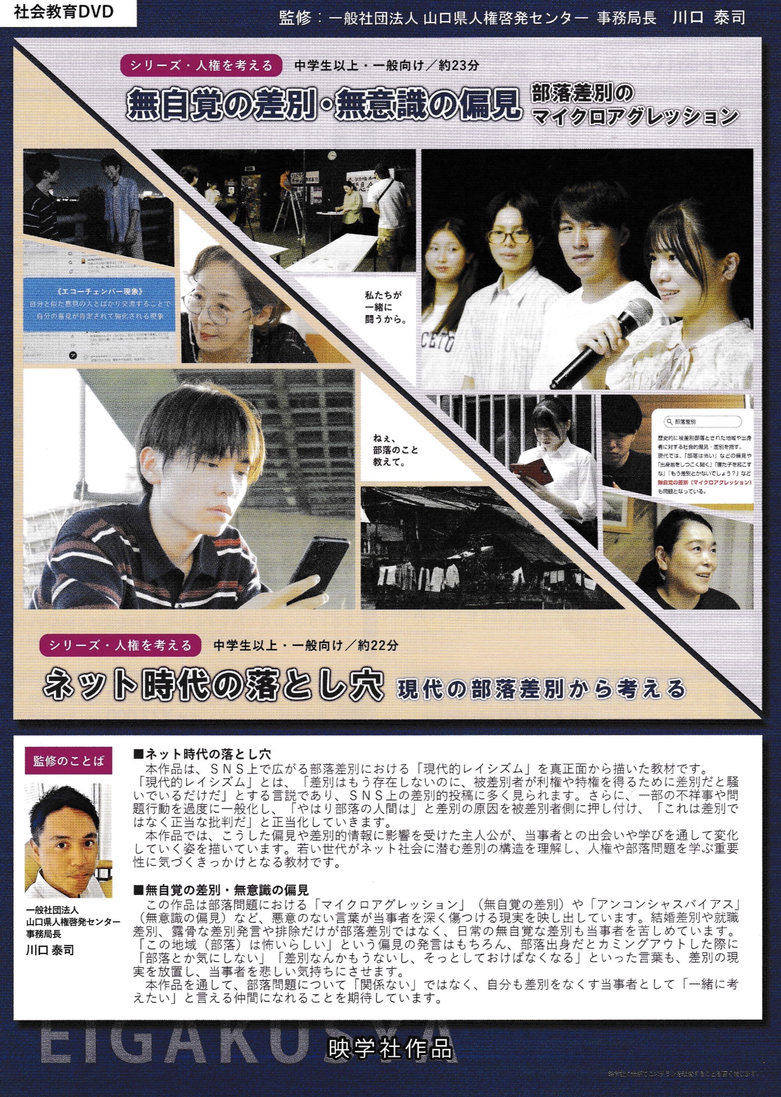 | 考えてみよう差別の歴史 ①古代の身分と差別(24分) ②中世のケガレ観と差別(約21分) ③近世の差別と被差別民のくらし(22分) | シリーズ番外編「恥ずかしい」のはどっちだ / 差別する側・される側~江嶋修作~(27分) | 私の中の差別意識(24分) |